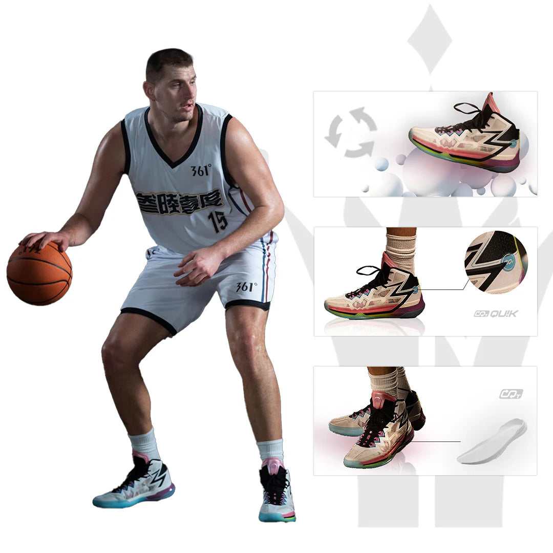 BIG3 Future series is the first 361 Degrees sneaker series Nikola Jokić played in. It is the all-time best basketball shoe featuring a "double-layer engine drive" consists of three components:Qu!kCQTECH (CQT) midsole: the upper layer to accumulate more energy for pushing forward.SOAR PLATE: the fork-shape carbon-fiber plate between the two midsole layers to provide great support for explosive movements.Qu!kFLAMECQT (FLAMECQT) foam: the bottom layer for extra comfort and energy return.